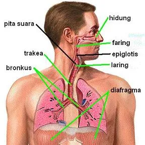 Pada saat manusia bernapas, udara dari lingkungan luar akan masuk ke dalam sistem pernapasan melalui organ-argan yang menyusunnya. Hidung merupakan organ pertama yang dilaluinya. Di dalam rongga hidung terdapat rambut-rambut dan selaput lendir yang berguna untuk menyaring udara, menghangatkan udara dan mengatur kelembaban udara yang akan masuk ke paru-paru. Setelah melewati hidung, udara akan melewati faring yang merupakan persimpangan antara rongga mulut ke esofagus dan rongga hidung ke batang tenggorokan. Dr faring udara akan melewati laring ( pangkal tenggorok ) yang memiliki katup pangkal tenggorokan ( epiglotis ). Pada laring juga terdapat selaput suara . Dari laring udara akan masuk ke batang tenggorokan ( trakhea ) yang tersusun atas cincin-cincin tulang rawan, Pada bagian dalam trakhea terdapat selaput lendir yg sel-selnya memiliki rambut getar ( cilia ) yg berfungsi menolak masuknya benda asing bersama-sama udara. Pada bagian akhir, ujung trakhea bercabang dua yang disebut bronkhus.Yang kanan akan masuk ke dalam paru-paru kanan, sedang yang kiri akan masuk paru-paru kiri. Di dalam paru-paru bronkhus bercabang-cabang menjadi bronkhiolus. Cabang-cabang terhalus dari bronkhiolus akan masuk ke dalam gelembung paru-paru ( alveolus ). Dinding alveolus terdiri atas satu lapis sel epitelium, dan banyak mengandung pembuluh kapiler. Di sinilah oksigen akan berdifusi ke dalam darah dan karbon dioksida serta air dilepaskan ke lingkungan.